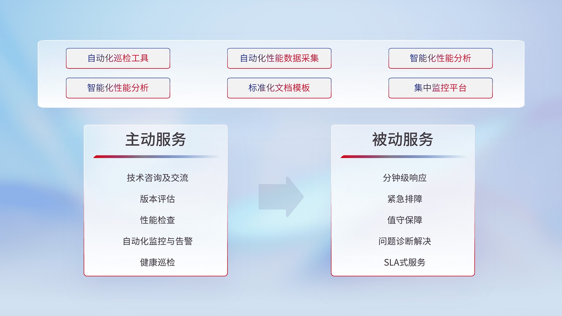智能化工具和标准化文档,,保障服务质量,,提供主动服务(包含技术咨询、、、、版本评估、、、、性能检查、、、、自动化监控与告警、、、健康巡检)和被动服务包含(分钟级响应、、、紧急排障、、值守保障、、、问题诊断解决、、、SLA服务)。。